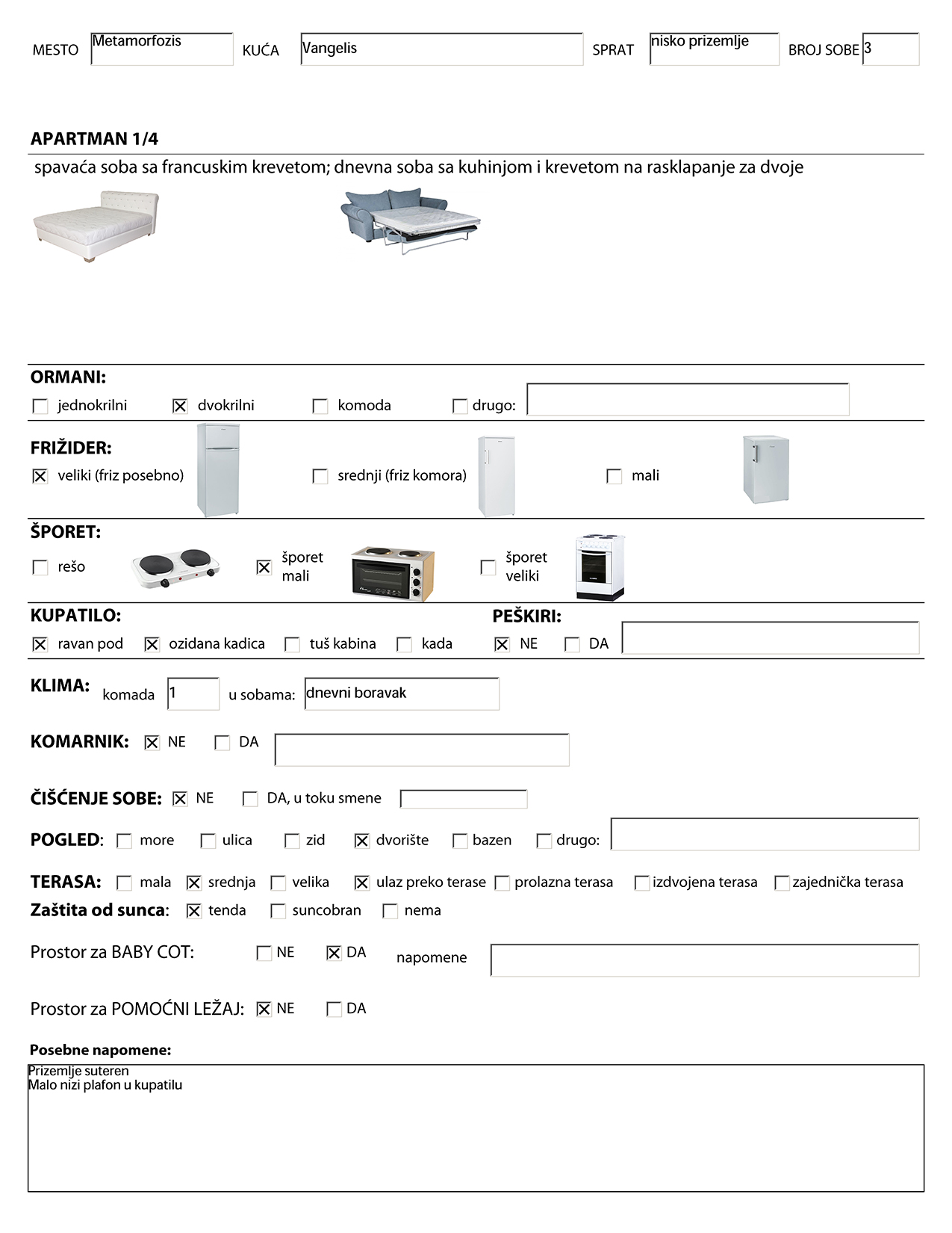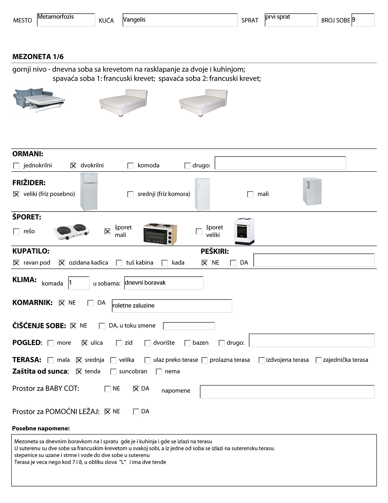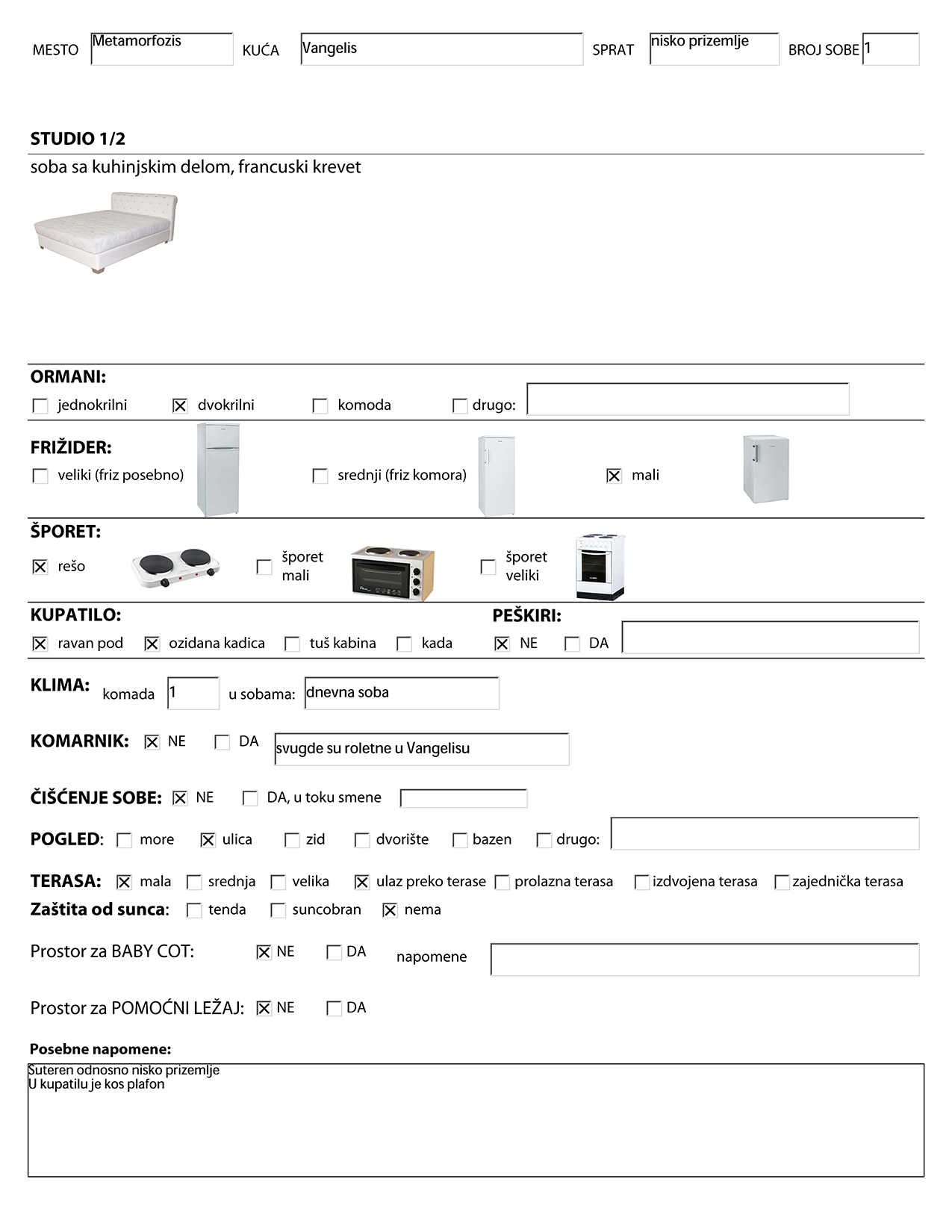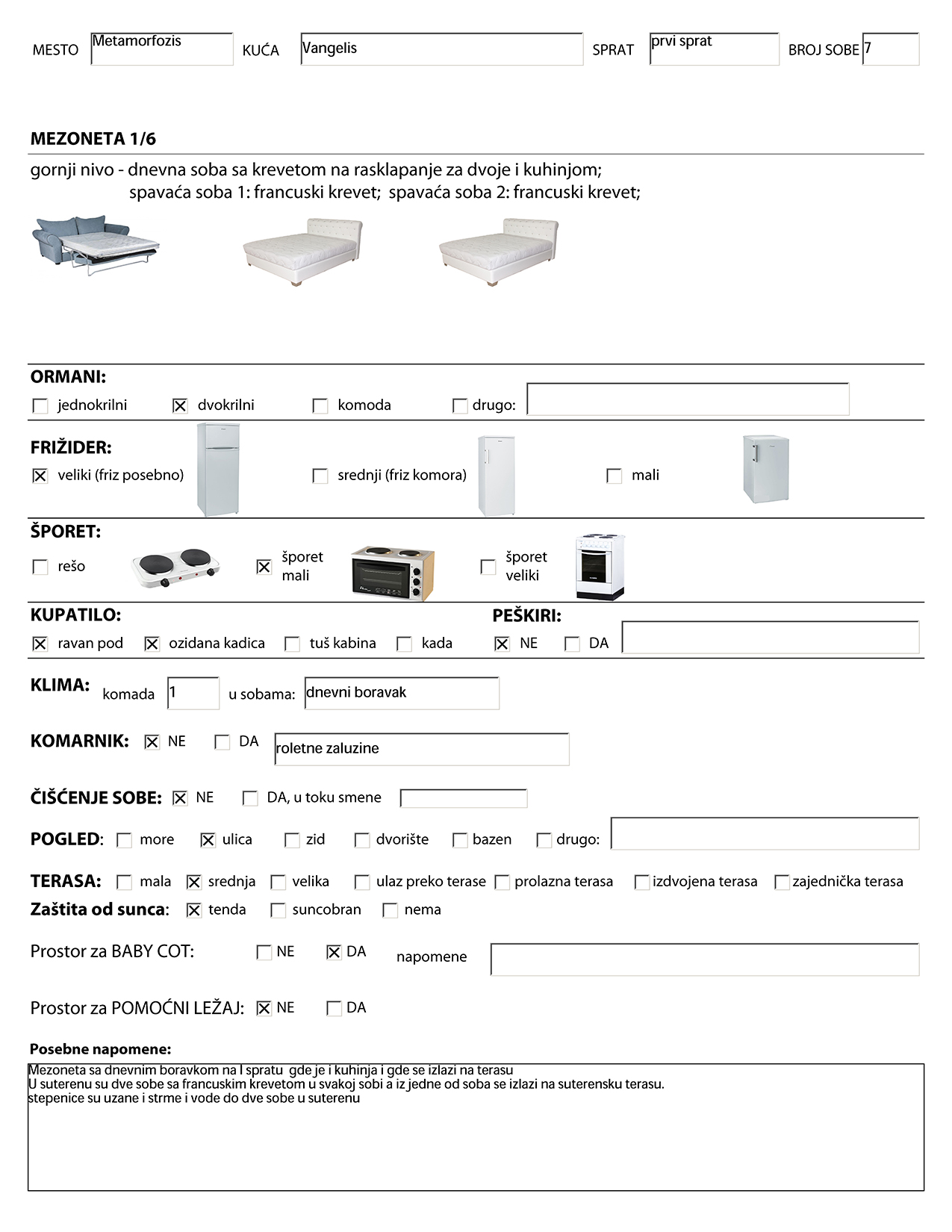 Slike kreveta, frižidera i kuhinjske opreme prikazane u ovom izveštaju o opremljenosti sobe su ilustrativnog karaktera. Izgled nameštaja, dizajn i slično je saobrazan sa slikama smeštaja u kući koje možete videti u katalogu i na sajtu. Ovaj izveštaj samo govori o tipovima ležajeva i ostale opreme. Tokom vremena je moguće da će usled loma ili kvara kreveta ili opreme neki krevet ili oprema biti zamenjeni bez da o tome bude obavešten Organizator pa samim tim ni gost. Organizator u tom slučaju ostaje u obavezi samo za ugovorene usluge u smislu broja ležaja i osnovnu kuhinjsku opremu (rešo sa dve ringle i mali frižider).