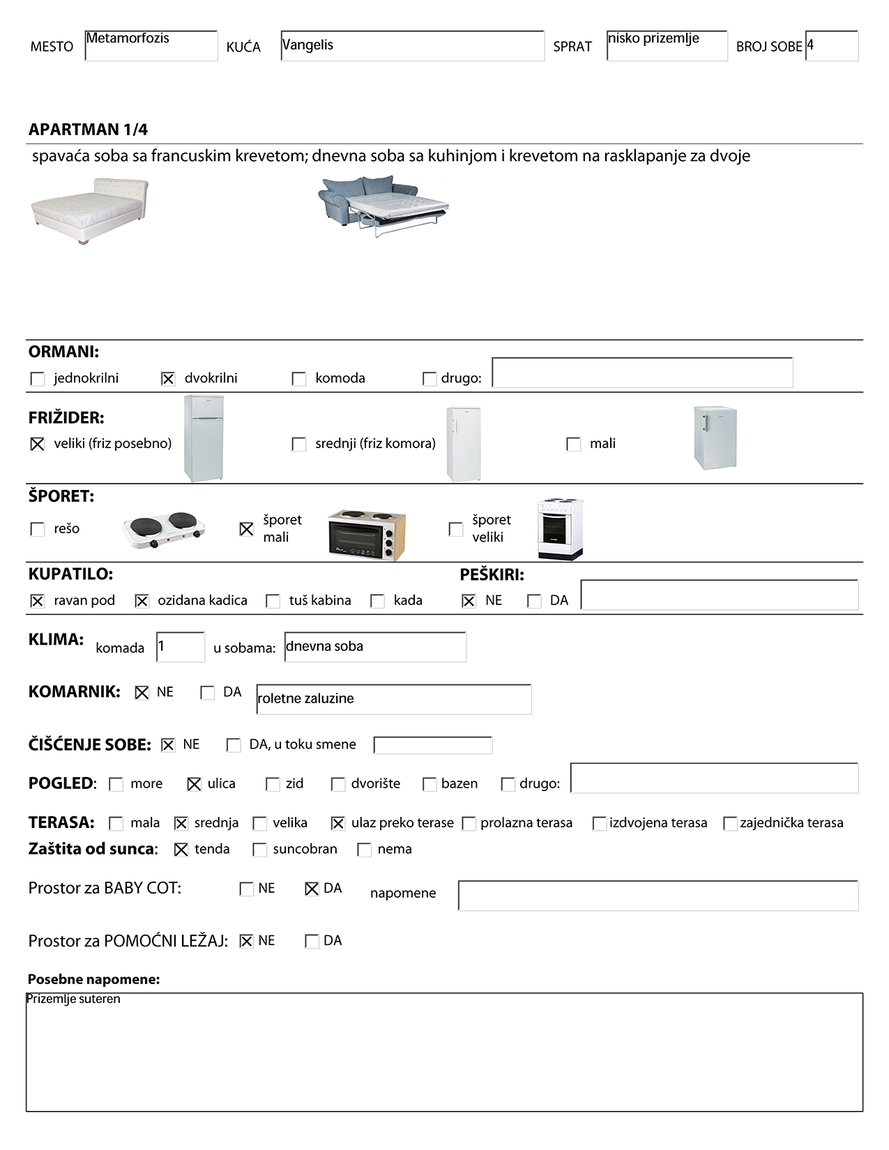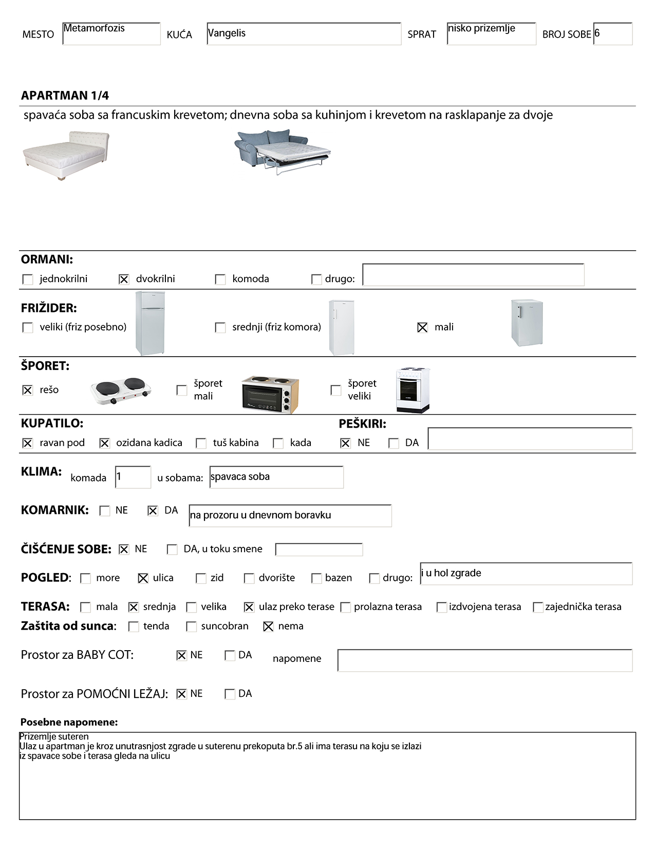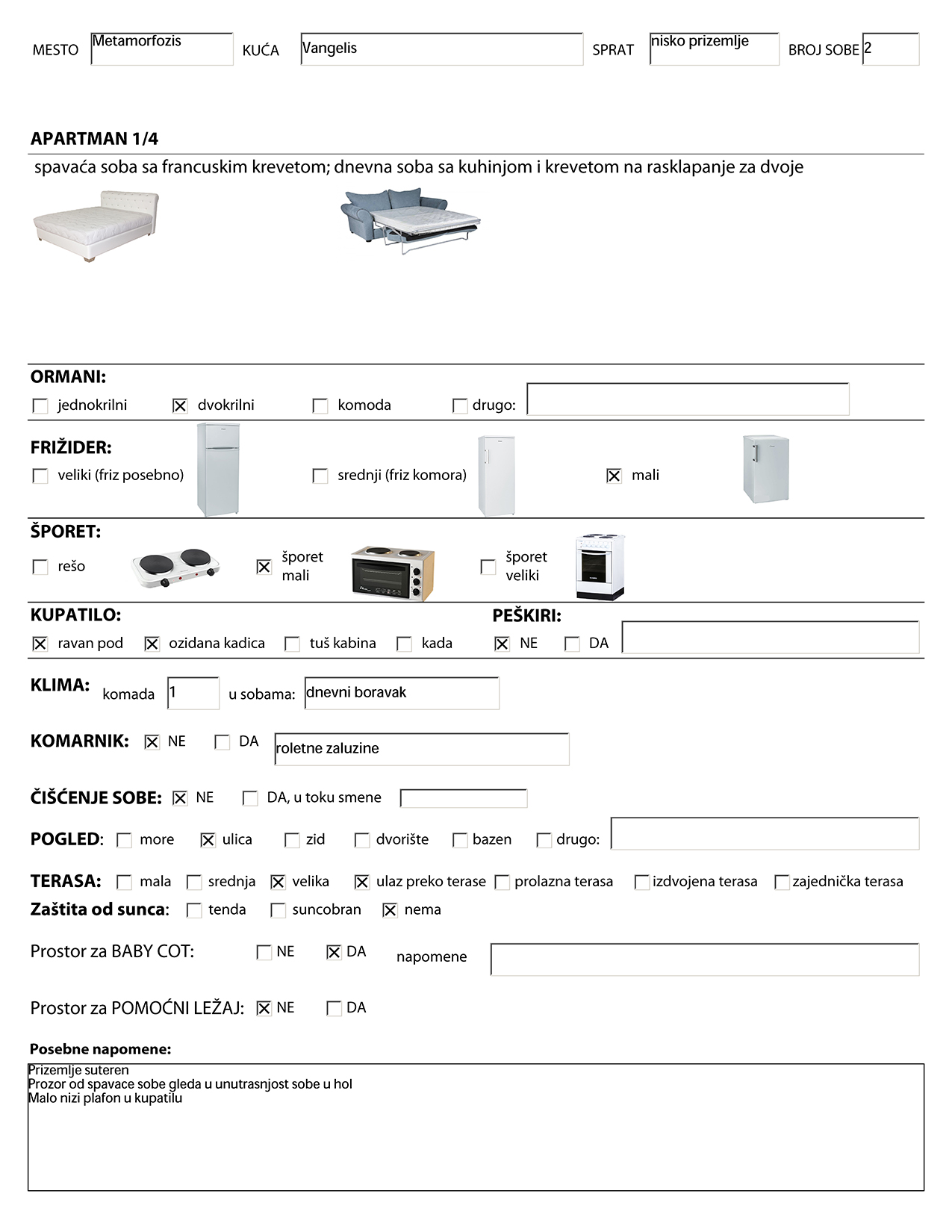 Slike kreveta, frižidera i kuhinjske opreme prikazane u ovom izveštaju o opremljenosti sobe su ilustrativnog karaktera. Izgled nameštaja, dizajn i slično je saobrazan sa slikama smeštaja u kući koje možete videti u katalogu i na sajtu. Ovaj izveštaj samo govori o tipovima ležajeva i ostale opreme. Tokom vremena je moguće da će usled loma ili kvara kreveta ili opreme neki krevet ili oprema biti zamenjeni bez da o tome bude obavešten Organizator pa samim tim ni gost. Organizator u tom slučaju ostaje u obavezi samo za ugovorene usluge u smislu broja ležaja i osnovnu kuhinjsku opremu (rešo sa dve ringle i mali frižider).