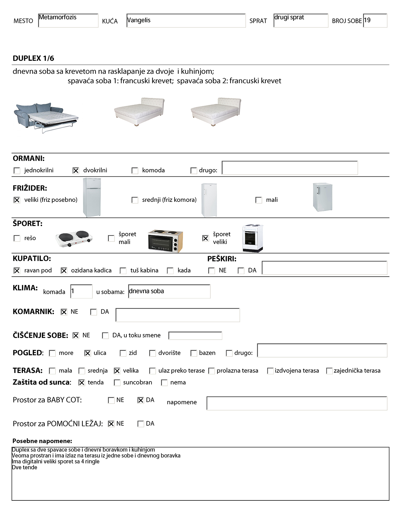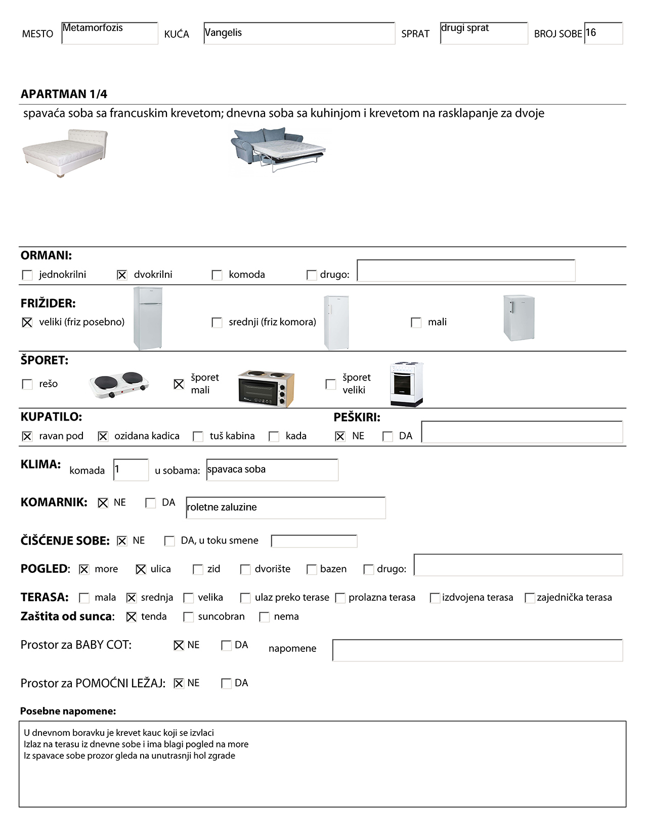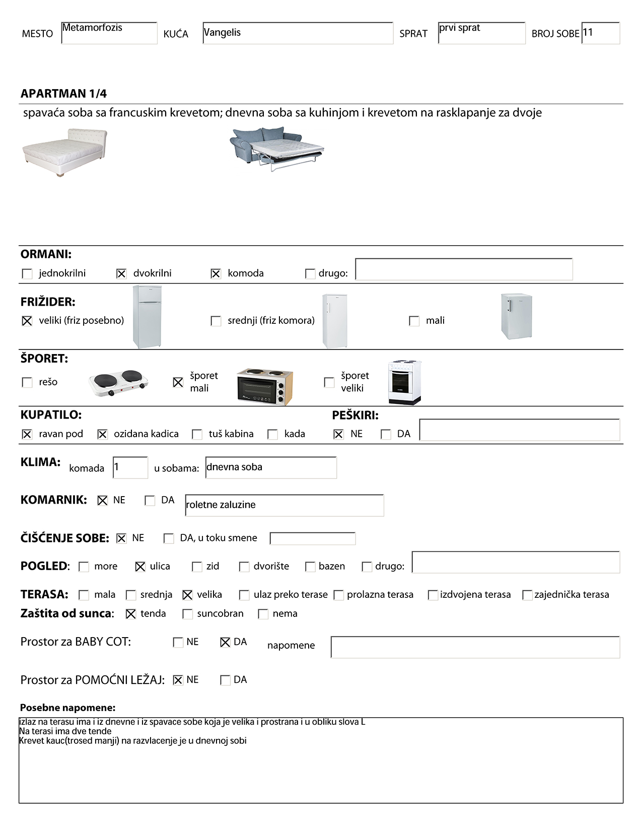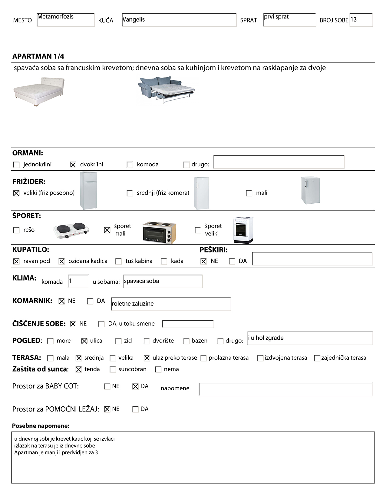 Slike kreveta, frižidera i kuhinjske opreme prikazane u ovom izveštaju o opremljenosti sobe su ilustrativnog karaktera. Izgled nameštaja, dizajn i slično je saobrazan sa slikama smeštaja u kući koje možete videti u katalogu i na sajtu. Ovaj izveštaj samo govori o tipovima ležajeva i ostale opreme. Tokom vremena je moguće da će usled loma ili kvara kreveta ili opreme neki krevet ili oprema biti zamenjeni bez da o tome bude obavešten Organizator pa samim tim ni gost. Organizator u tom slučaju ostaje u obavezi samo za ugovorene usluge u smislu broja ležaja i osnovnu kuhinjsku opremu (rešo sa dve ringle i mali frižider).