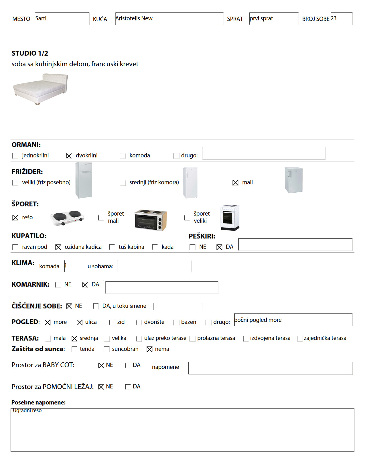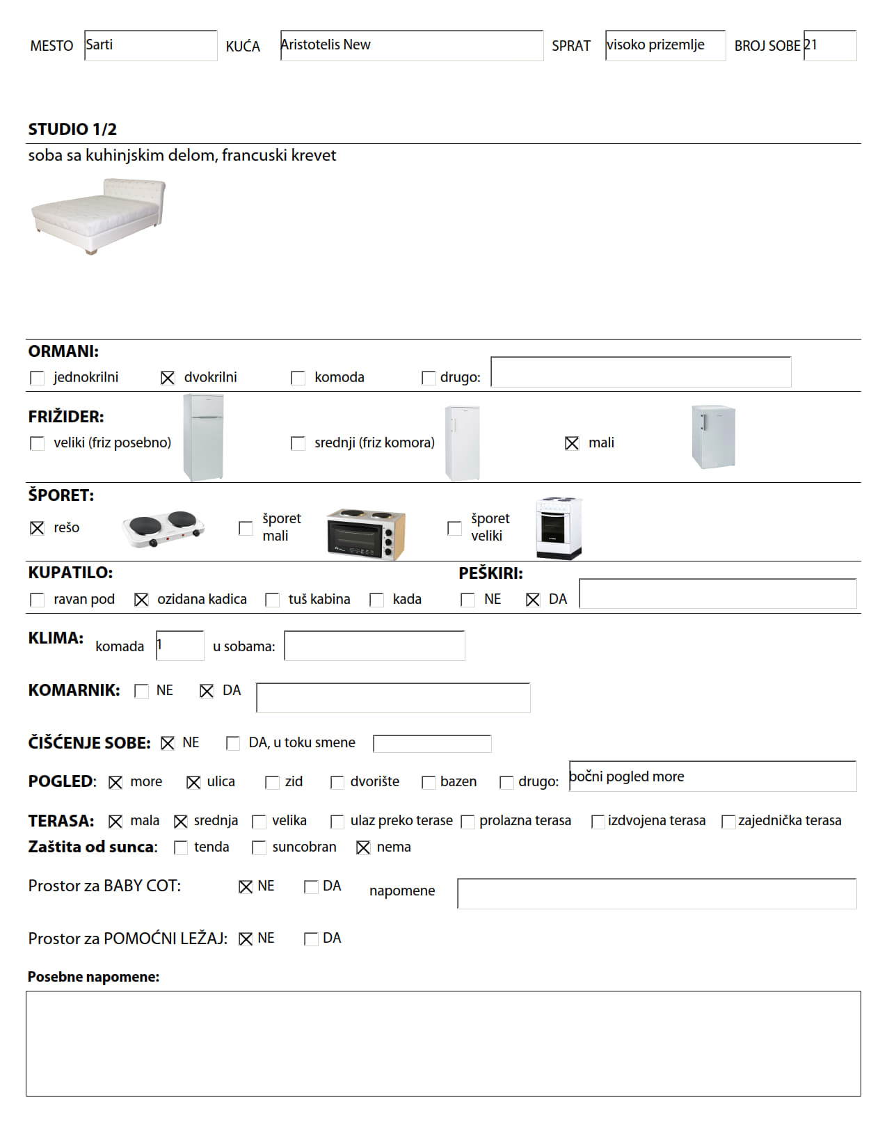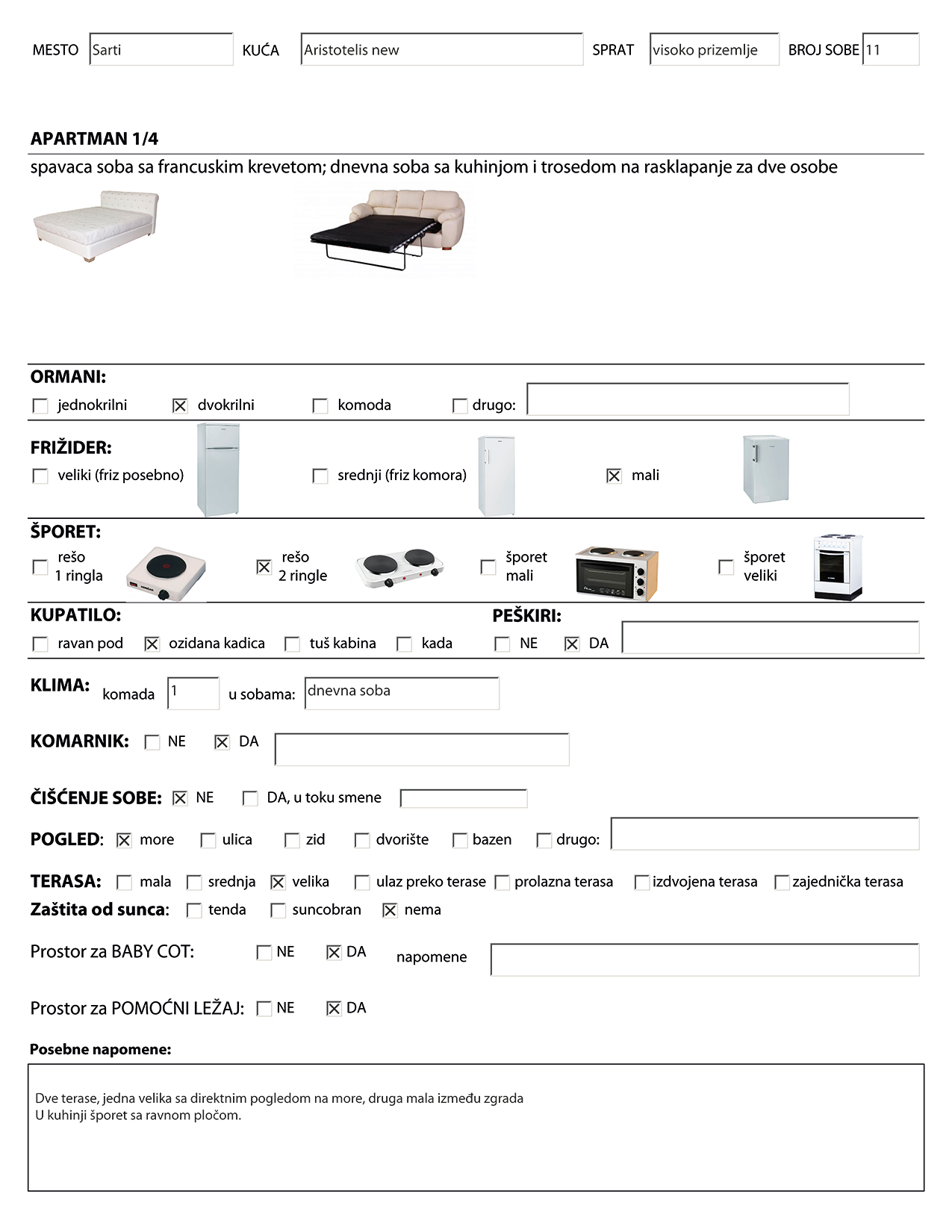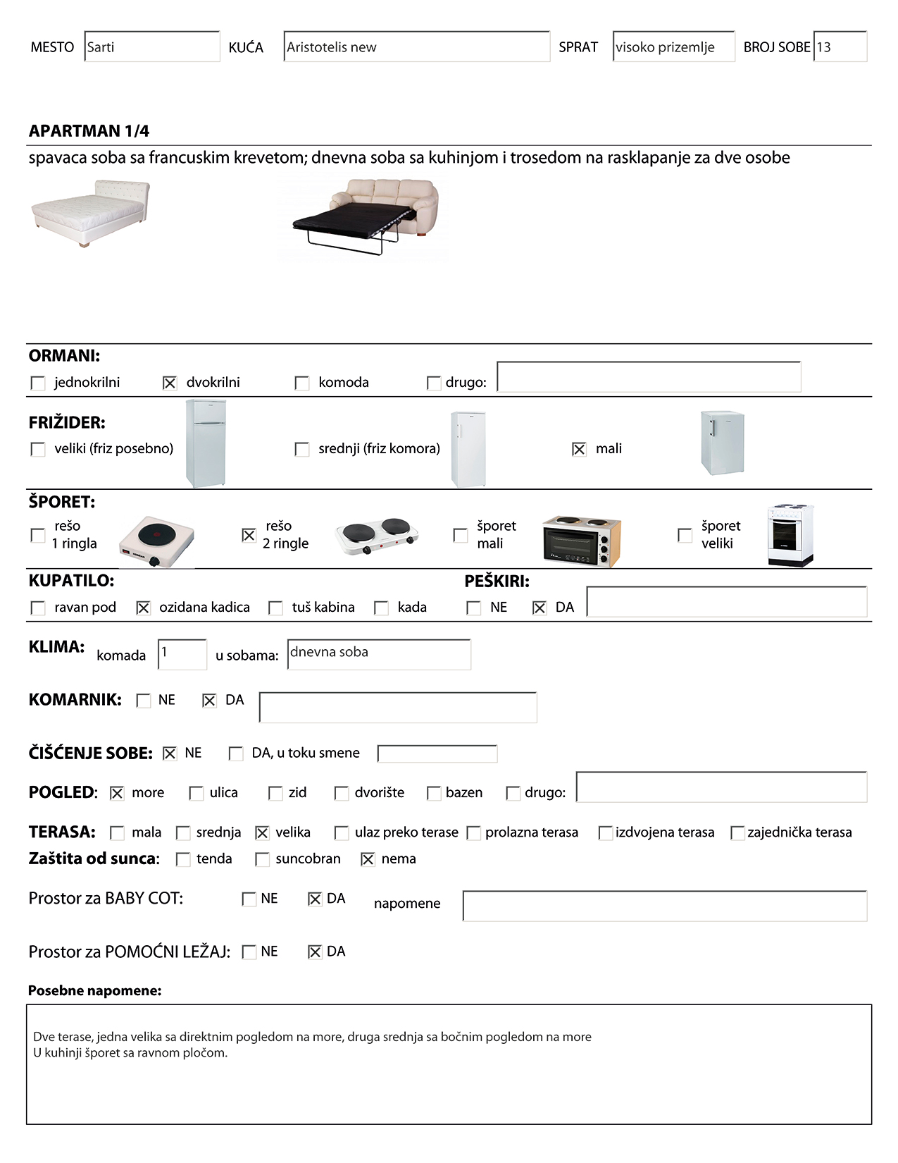 Slike kreveta, frižidera i kuhinjske opreme prikazane u ovom izveštaju o opremljenosti sobe su ilustrativnog karaktera. Izgled nameštaja, dizajn i slično je saobrazan sa slikama smeštaja u kući koje možete videti u katalogu i na sajtu. Ovaj izveštaj samo govori o tipovima ležajeva i ostale opreme. Tokom vremena je moguće da će usled loma ili kvara kreveta ili opreme neki krevet ili oprema biti zamenjeni bez da o tome bude obavešten Organizator pa samim tim ni gost. Organizator u tom slučaju ostaje u obavezi samo za ugovorene usluge u smislu broja ležaja i osnovnu kuhinjsku opremu (rešo sa dve ringle i mali frižider).