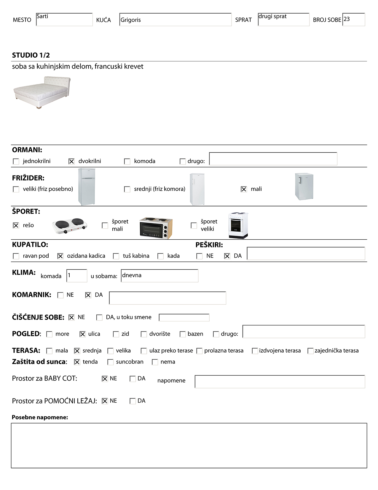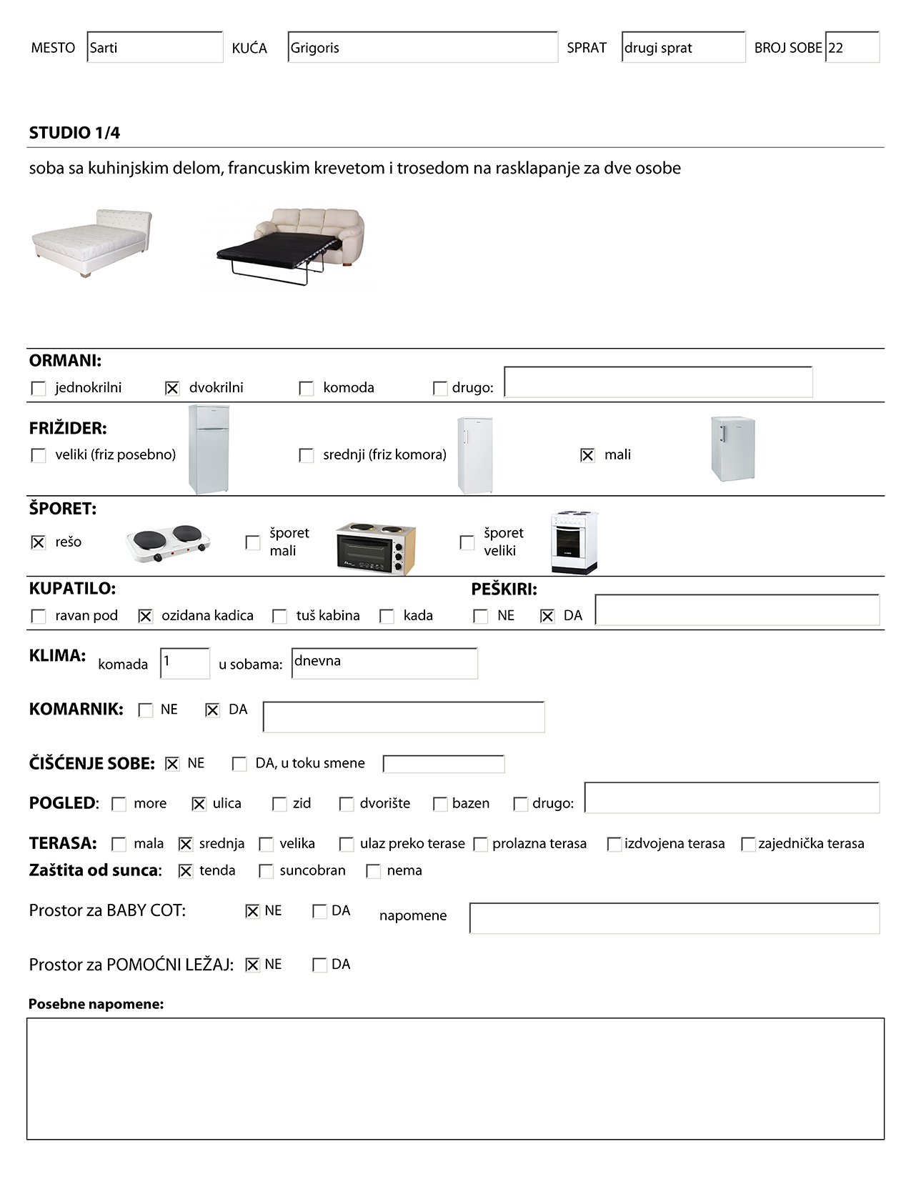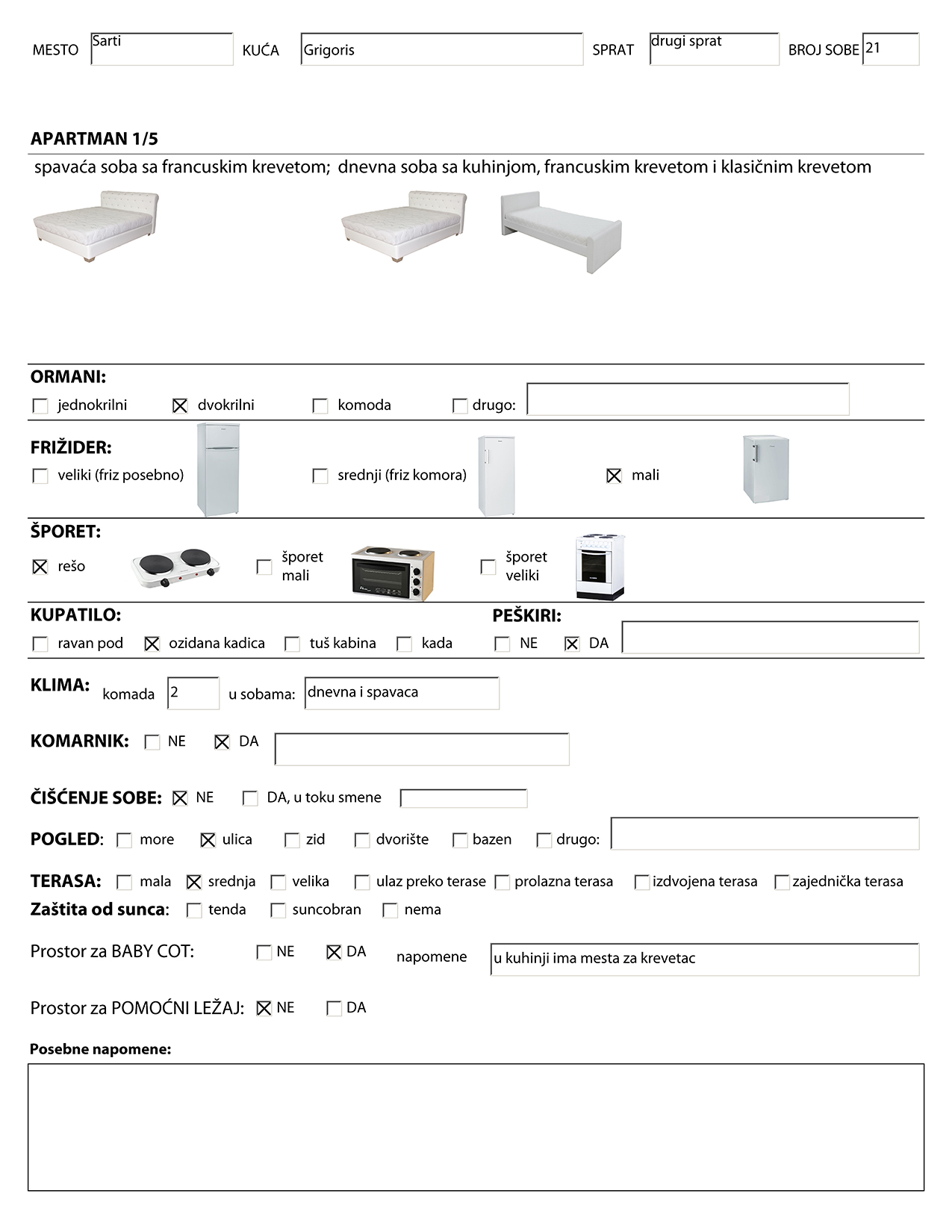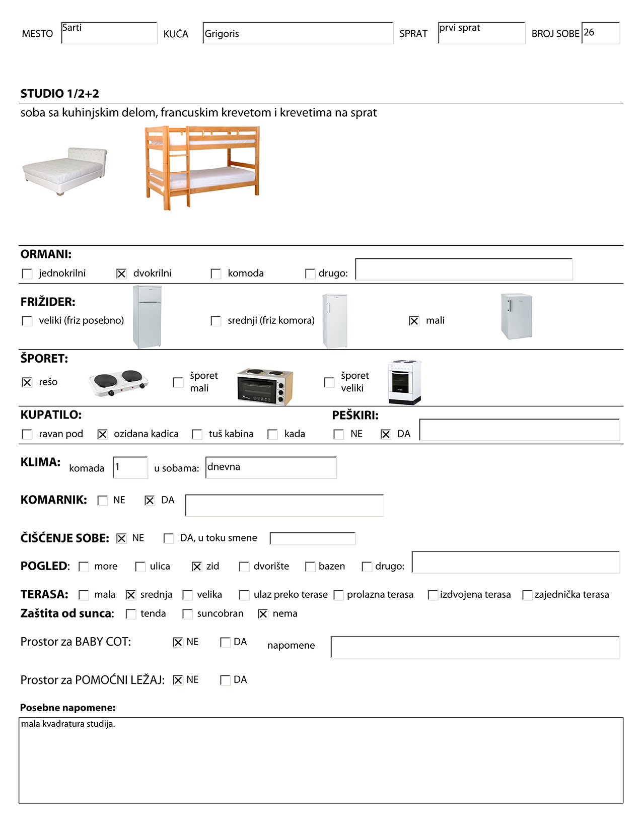 Slike kreveta, frižidera i kuhinjske opreme prikazane u ovom izveštaju o opremljenosti sobe su ilustrativnog karaktera. Izgled nameštaja, dizajn i slično je saobrazan sa slikama smeštaja u kući koje možete videti u katalogu i na sajtu. Ovaj izveštaj samo govori o tipovima ležajeva i ostale opreme. Tokom vremena je moguće da će usled loma ili kvara kreveta ili opreme neki krevet ili oprema biti zamenjeni bez da o tome bude obavešten Organizator pa samim tim ni gost. Organizator u tom slučaju ostaje u obavezi samo za ugovorene usluge u smislu broja ležaja i osnovnu kuhinjsku opremu (rešo sa dve ringle i mali frižider).