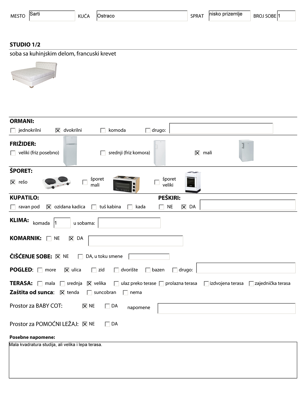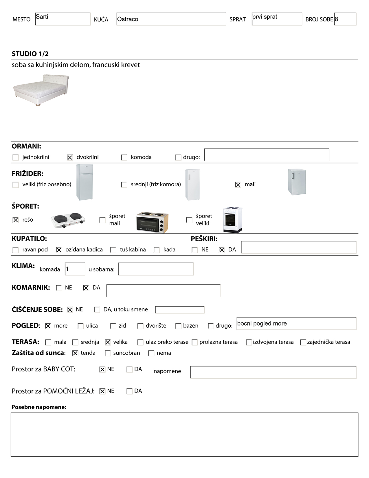 Slike kreveta, frižidera i kuhinjske opreme prikazane u ovom izveštaju o opremljenosti sobe su ilustrativnog karaktera. Izgled nameštaja, dizajn i slično je saobrazan sa slikama smeštaja u kući koje možete videti u katalogu i na sajtu. Ovaj izveštaj samo govori o tipovima ležajeva i ostale opreme. Tokom vremena je moguće da će usled loma ili kvara kreveta ili opreme neki krevet ili oprema biti zamenjeni bez da o tome bude obavešten Organizator pa samim tim ni gost. Organizator u tom slučaju ostaje u obavezi samo za ugovorene usluge u smislu broja ležaja i osnovnu kuhinjsku opremu (rešo sa dve ringle i mali frižider).