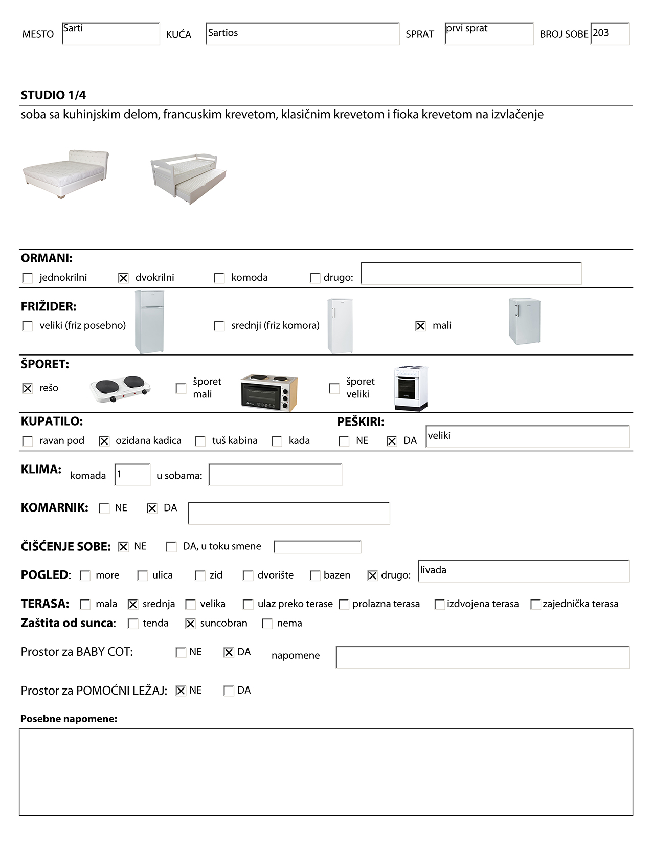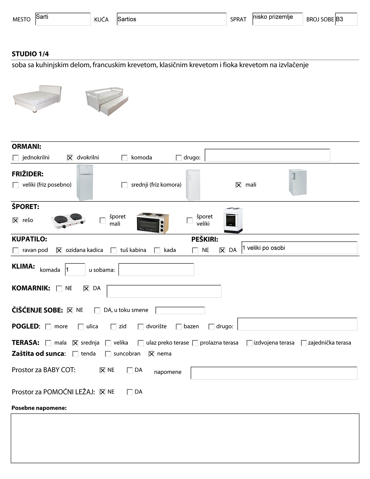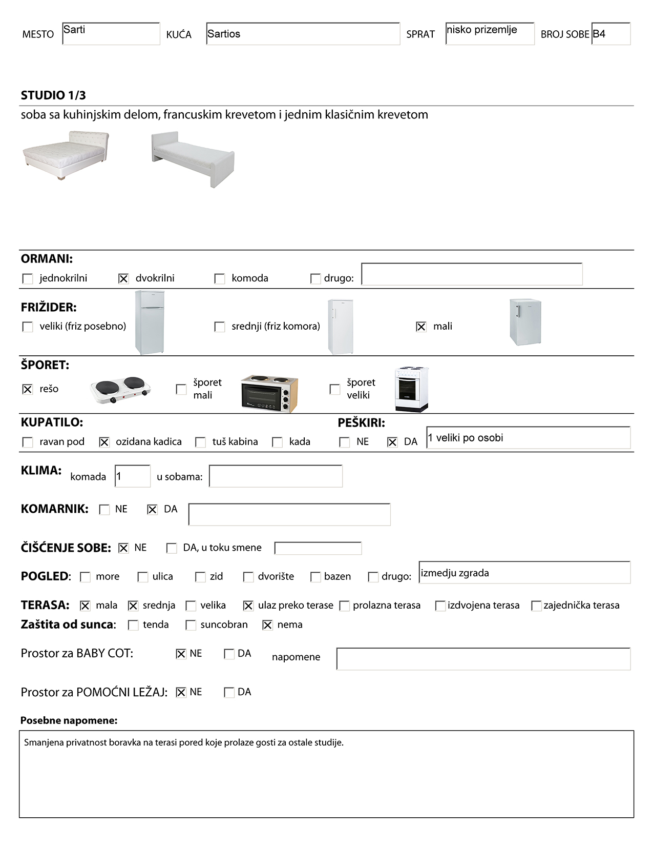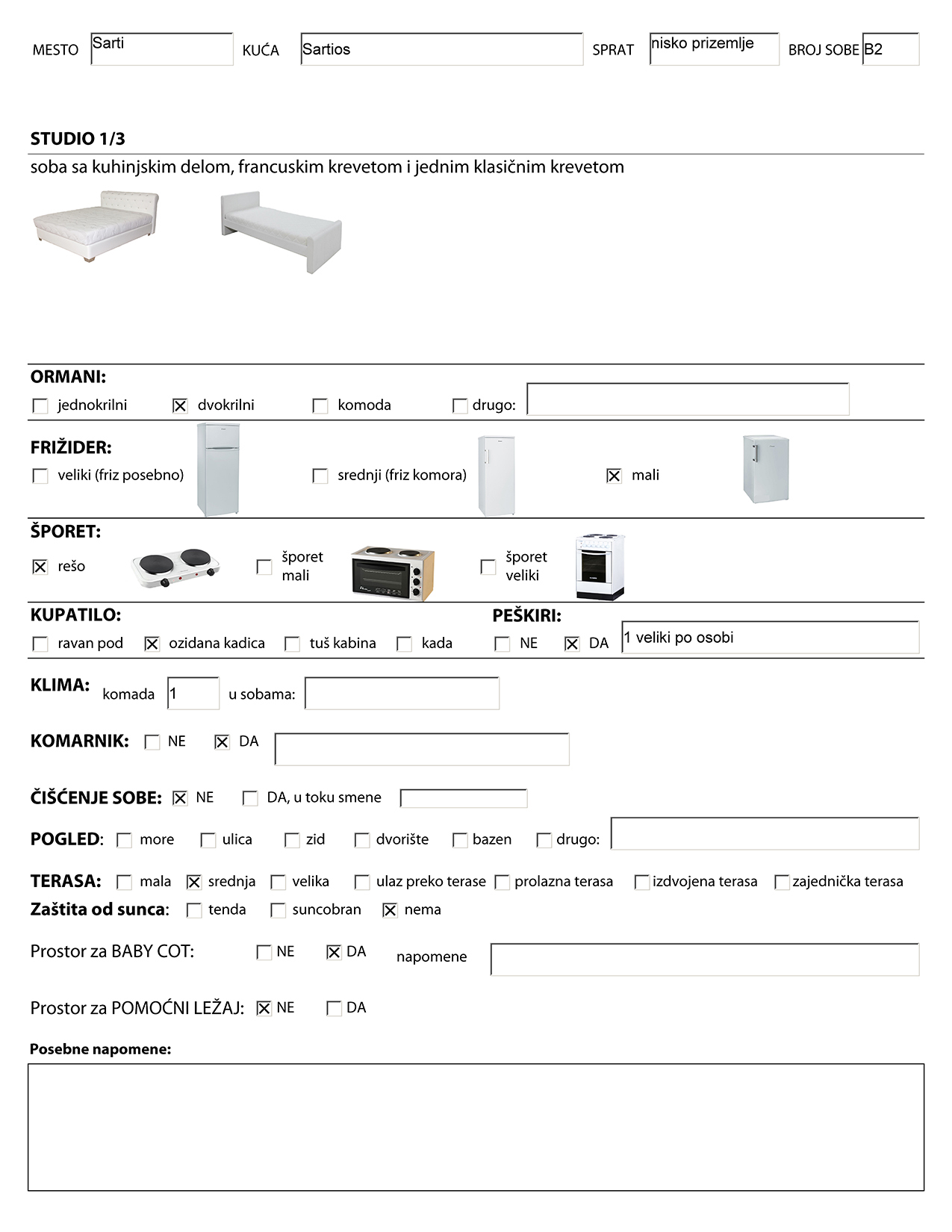 Slike kreveta, frižidera i kuhinjske opreme prikazane u ovom izveštaju o opremljenosti sobe su ilustrativnog karaktera. Izgled nameštaja, dizajn i slično je saobrazan sa slikama smeštaja u kući koje možete videti u katalogu i na sajtu. Ovaj izveštaj samo govori o tipovima ležajeva i ostale opreme. Tokom vremena je moguće da će usled loma ili kvara kreveta ili opreme neki krevet ili oprema biti zamenjeni bez da o tome bude obavešten Organizator pa samim tim ni gost. Organizator u tom slučaju ostaje u obavezi samo za ugovorene usluge u smislu broja ležaja i osnovnu kuhinjsku opremu (rešo sa dve ringle i mali frižider).
