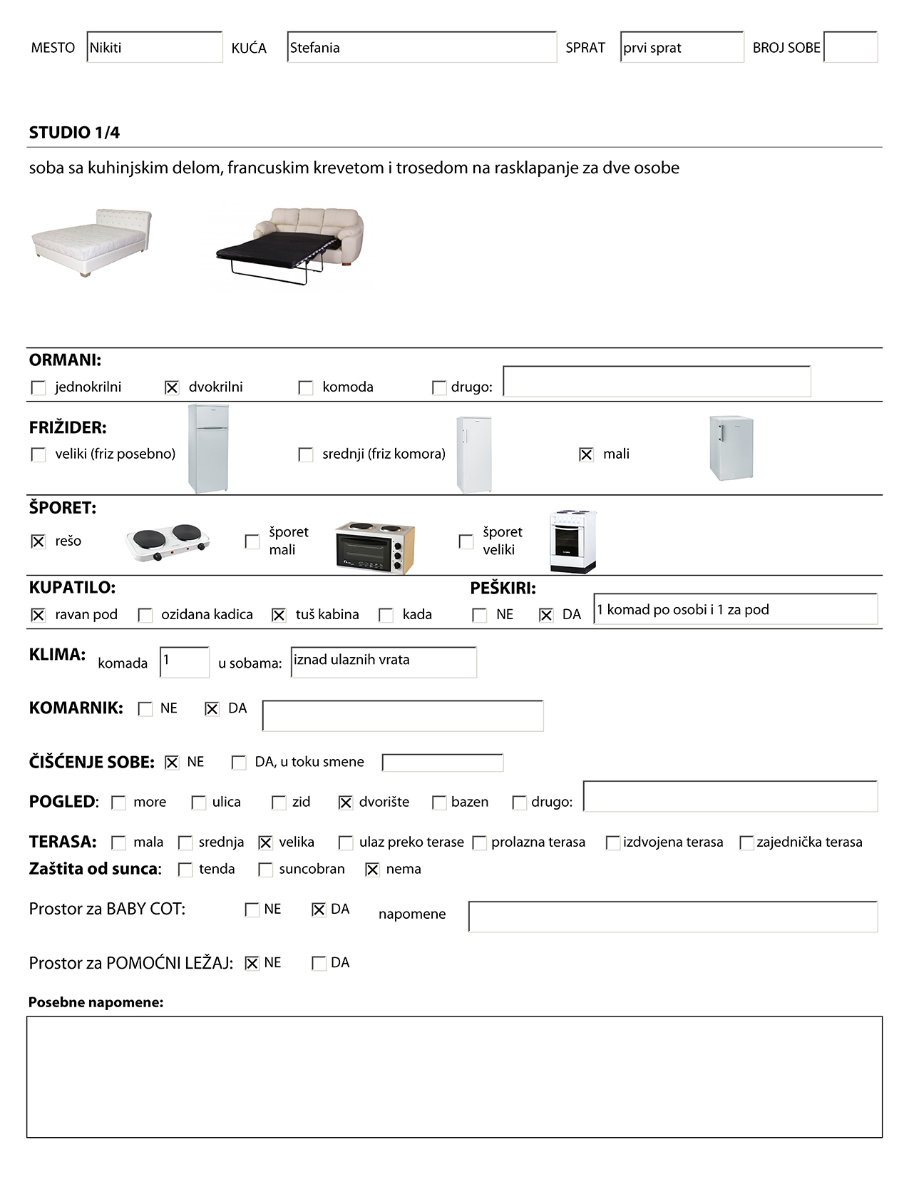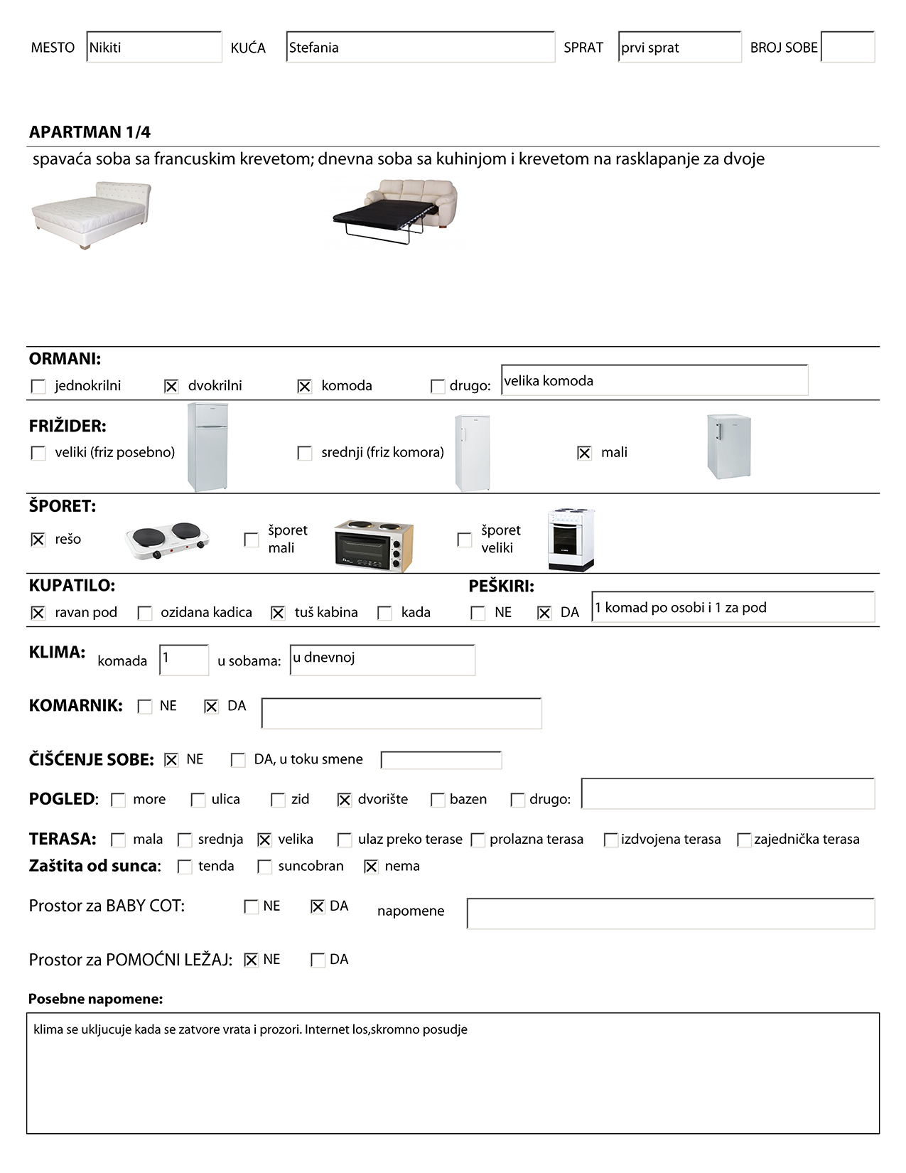 Slike kreveta, frižidera i kuhinjske opreme prikazane u ovom izveštaju o opremljenosti sobe su ilustrativnog karaktera. Izgled nameštaja, dizajn i slično je saobrazan sa slikama smeštaja u kući koje možete videti u katalogu i na sajtu. Ovaj izveštaj samo govori o tipovima ležajeva i ostale opreme. Tokom vremena je moguće da će usled loma ili kvara kreveta ili opreme neki krevet ili oprema biti zamenjeni bez da o tome bude obavešten Organizator pa samim tim ni gost. Organizator u tom slučaju ostaje u obavezi samo za ugovorene usluge u smislu broja ležaja i osnovnu kuhinjsku opremu (rešo sa dve ringle i mali frižider).