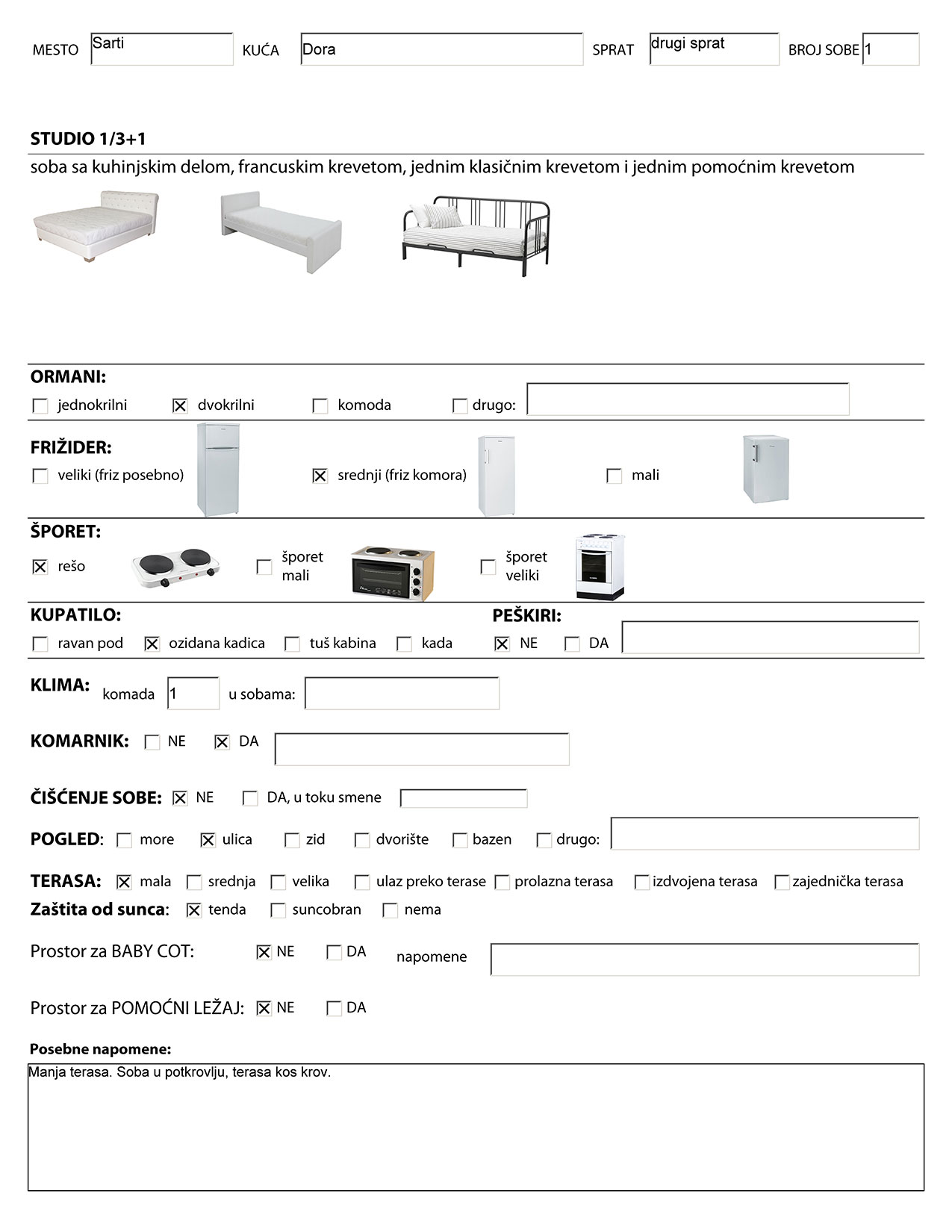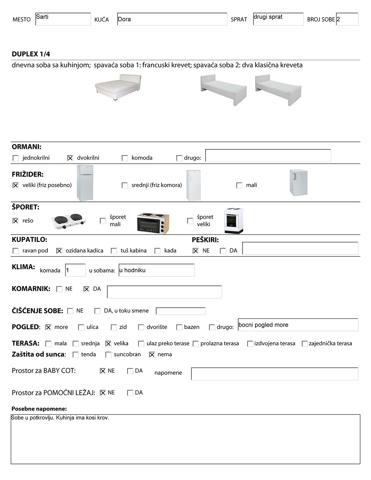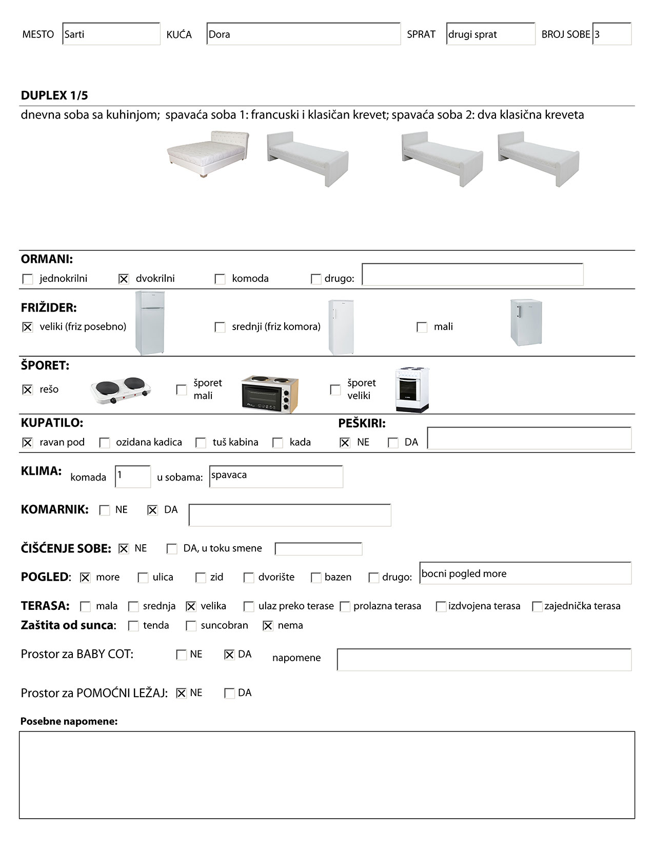 Slike kreveta, frižidera i kuhinjske opreme prikazane u ovom izveštaju o opremljenosti sobe su ilustrativnog karaktera. Izgled nameštaja, dizajn i slično je saobrazan sa slikama smeštaja u kući koje možete videti u katalogu i na sajtu. Ovaj izveštaj samo govori o tipovima ležajeva i ostale opreme. Tokom vremena je moguće da će usled loma ili kvara kreveta ili opreme neki krevet ili oprema biti zamenjeni bez da o tome bude obavešten Organizator pa samim tim ni gost. Organizator u tom slučaju ostaje u obavezi samo za ugovorene usluge u smislu broja ležaja i osnovnu kuhinjsku opremu (rešo sa dve ringle i mali frižider).