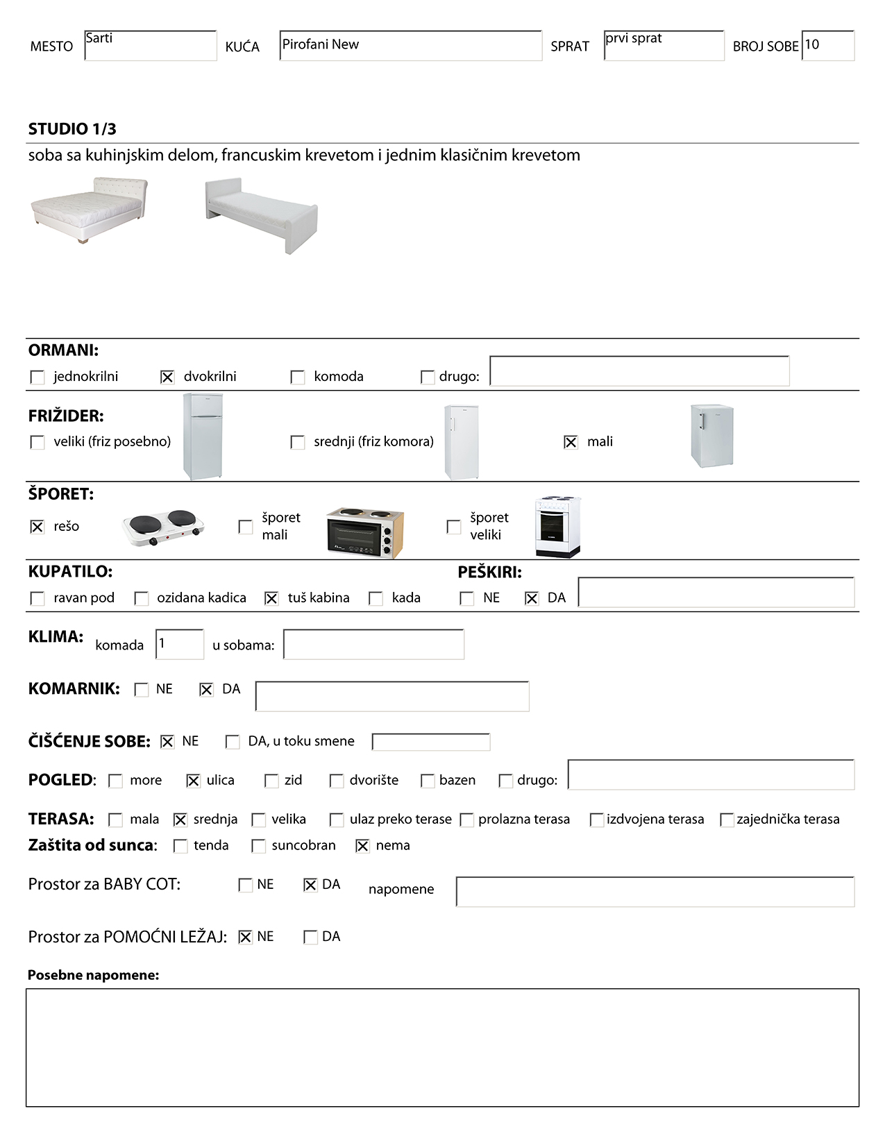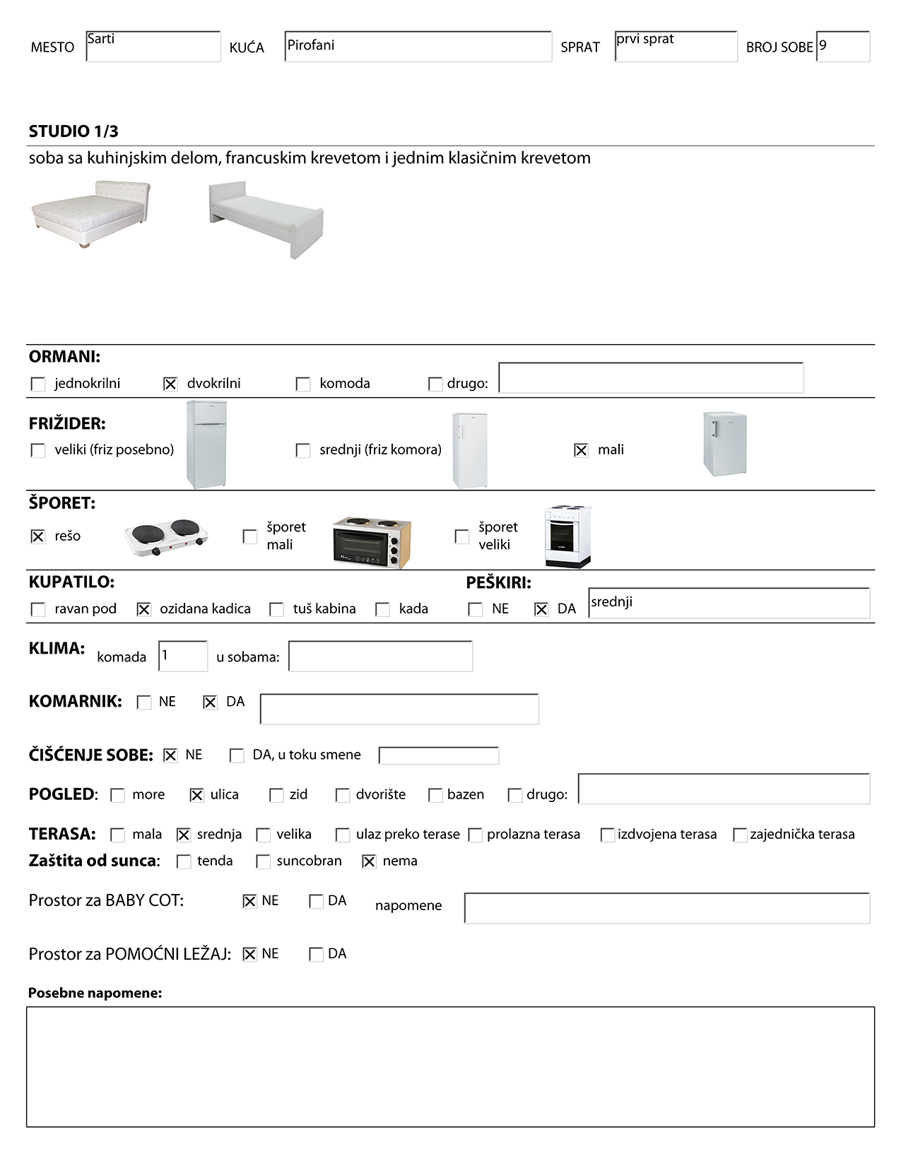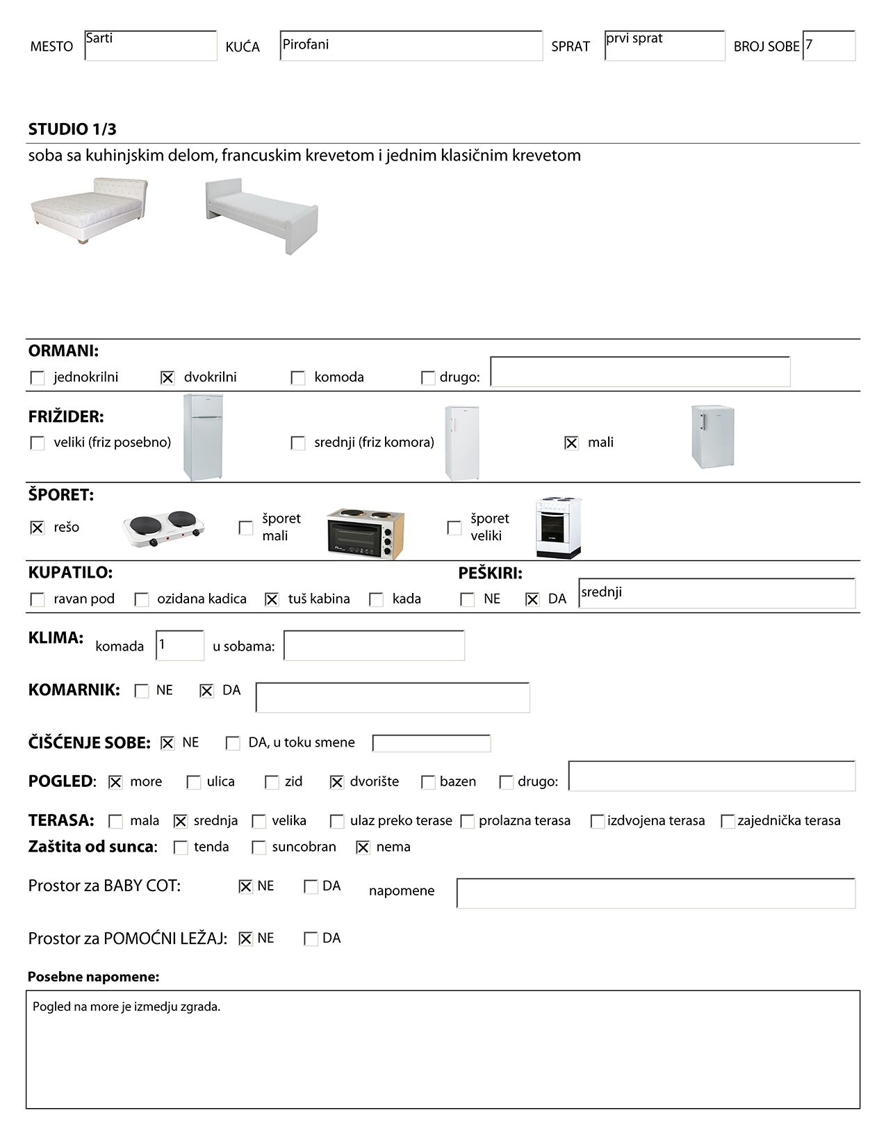 Slike kreveta, frižidera i kuhinjske opreme prikazane u ovom izveštaju o opremljenosti sobe su ilustrativnog karaktera. Izgled nameštaja, dizajn i slično je saobrazan sa slikama smeštaja u kući koje možete videti u katalogu i na sajtu. Ovaj izveštaj samo govori o tipovima ležajeva i ostale opreme. Tokom vremena je moguće da će usled loma ili kvara kreveta ili opreme neki krevet ili oprema biti zamenjeni bez da o tome bude obavešten Organizator pa samim tim ni gost. Organizator u tom slučaju ostaje u obavezi samo za ugovorene usluge u smislu broja ležaja i osnovnu kuhinjsku opremu (rešo sa dve ringle i mali frižider).