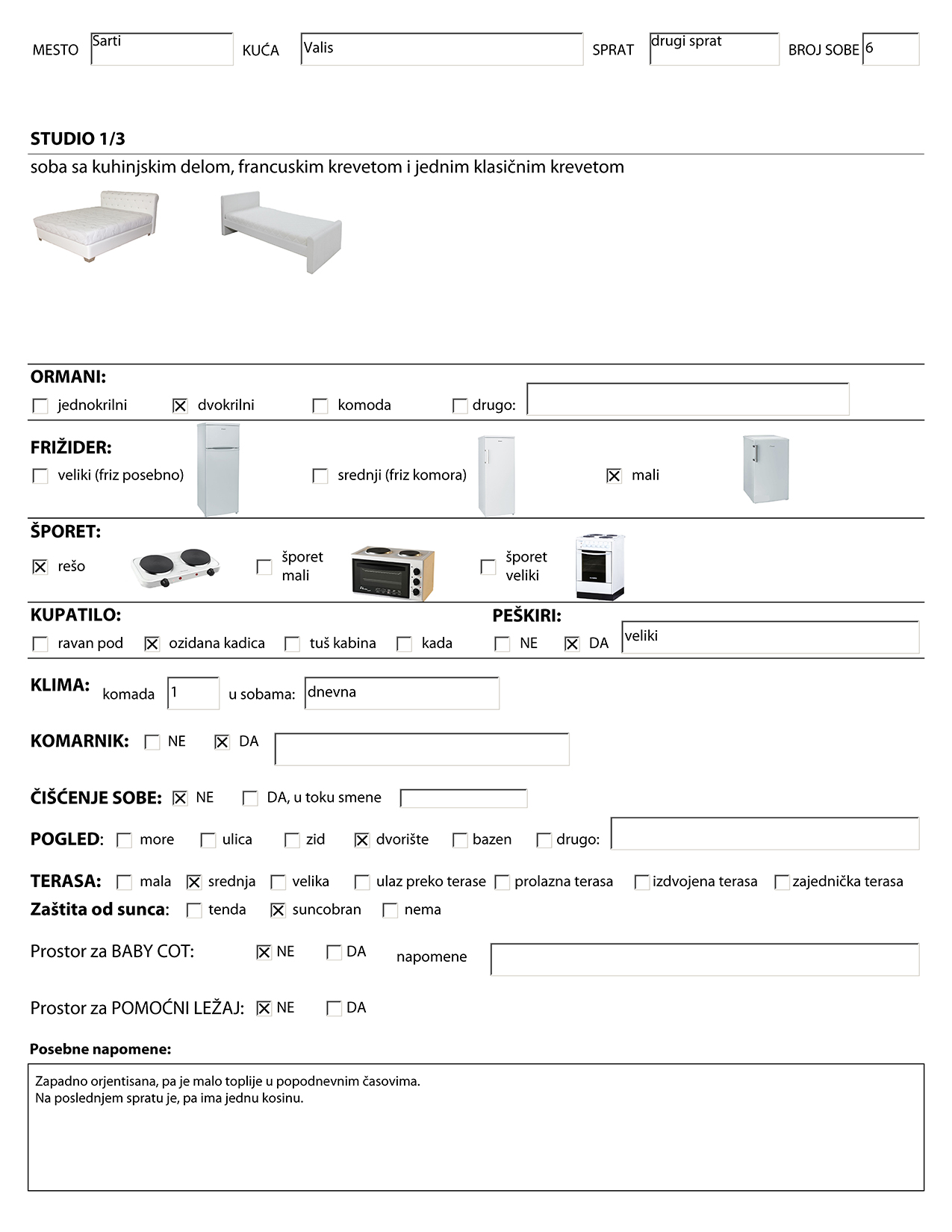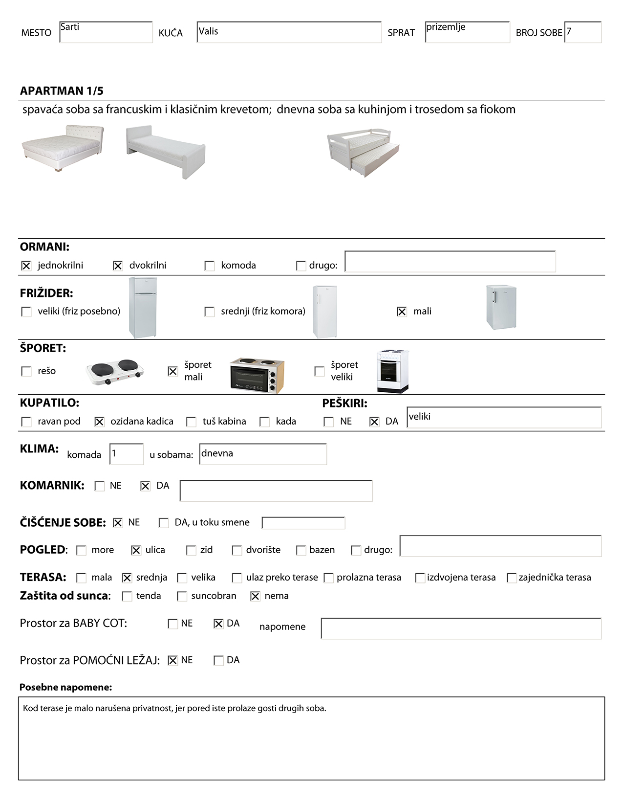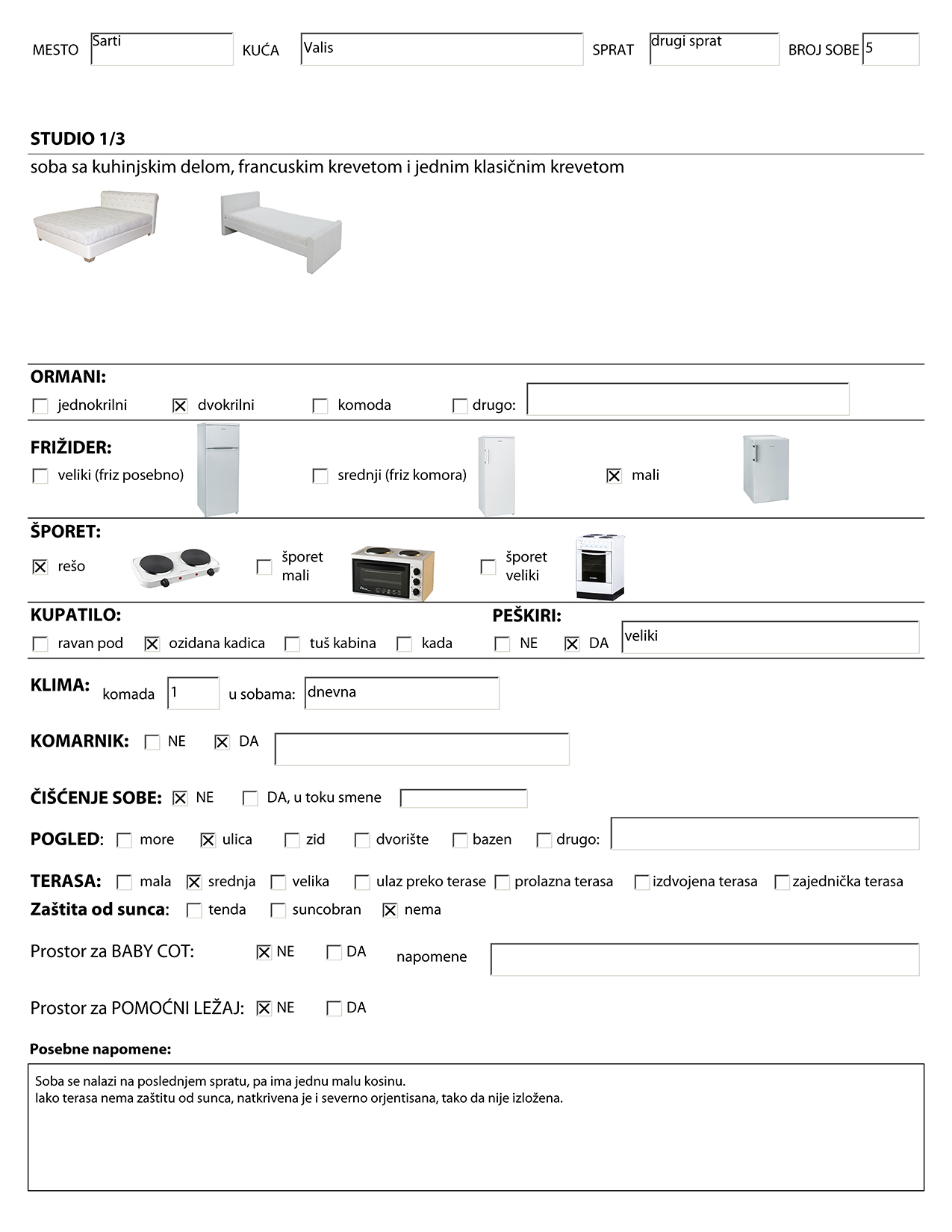 Slike kreveta, frižidera i kuhinjske opreme prikazane u ovom izveštaju o opremljenosti sobe su ilustrativnog karaktera. Izgled nameštaja, dizajn i slično je saobrazan sa slikama smeštaja u kući koje možete videti u katalogu i na sajtu. Ovaj izveštaj samo govori o tipovima ležajeva i ostale opreme. Tokom vremena je moguće da će usled loma ili kvara kreveta ili opreme neki krevet ili oprema biti zamenjeni bez da o tome bude obavešten Organizator pa samim tim ni gost. Organizator u tom slučaju ostaje u obavezi samo za ugovorene usluge u smislu broja ležaja i osnovnu kuhinjsku opremu (rešo sa dve ringle i mali frižider).