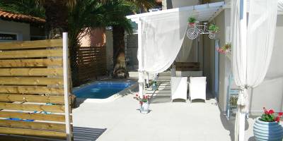 Kuća Dina se nalazi u mirnom starom delu Sartija na oko 60m od plaže. Potpuno je renovirana 2017. godine. Studiji se nalaze na prvom spratu. Svi imaju televizor, bežicni internet čije je korišćenje besplatno kao i klima uređaj čije se korišćenje posebno doplaćuje. Studio br. 4 takođe ima svoju ali izdvojenu terasu i zato ima nižu cenu.