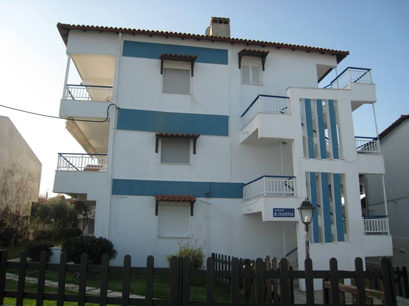 Vila Papas se nalazi na samom šetalištu pored mora, nedaleko od centra Pefkohorija. Trokrevetni apartmani se nalaze na prvom i drugom spratu vile. Apartmani sadrže opremljenu kuhinju (mini šporet, manji frižider i osnovni potrebni pribor), spavaću sobu sa jednim bračnim i jednim standardnim krevetom, kupatilo i terasu sa bočnim pogledom na more. Opremljeni su TV-om i klima-uređajem (uračunat u cenu u periodu 14.06-07.09). Veličina apartmana je cca 25m² + terasa. Vila Papas nema sopstveni parking.